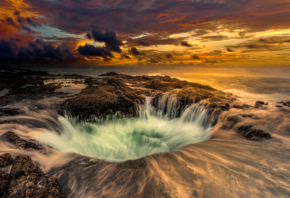 Thor’s Well is one of those attractions that photographers fantasize about.  It’s a collapsed cavern on the Oregon shore.  At high tide, the ocean literally pours thru the roof of the cave and it truly looks like the Pacific is draining into a massive well.  I had planned our trip to coincide with high tide and sunset…I was not disappointed!2015 PAC NW 08 09 1205crop