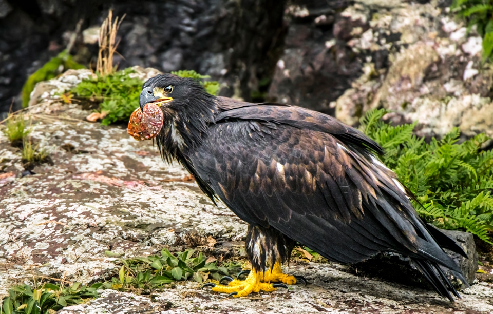 We weren’t more than 20 minutes out of the harbor before we came up to our first set of eagles (which seem as common as pigeons in Alaska). They were high in trees backlit by the overcast skies…which made for difficult photography. Then I noticed a immature Bald Eagle not more than 50′ from me down on the shore chomping on a Abalone shell. To be honest, I had no idea what had in its beak until I got home and processed the photos.