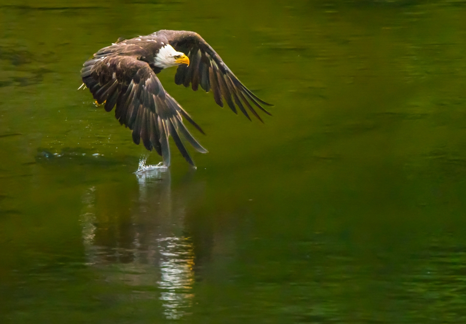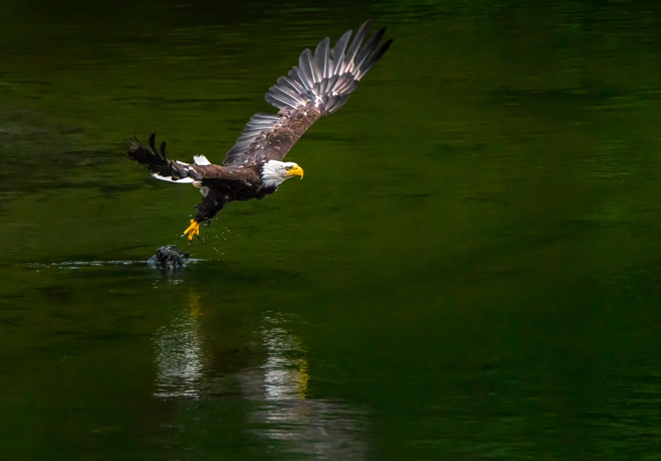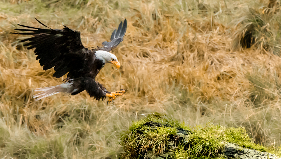 A few minutes later I noticed an eagle feeding on salmon by the edge of the same stream. While the rest of the tour spent quality time in the gift shop, I walked back out and watched the eagle hoping to catch it in flight. A few minutes before our bus pulled out, I was rewarded when the eagle suddenly took to flight and I ripped off a series of shots.