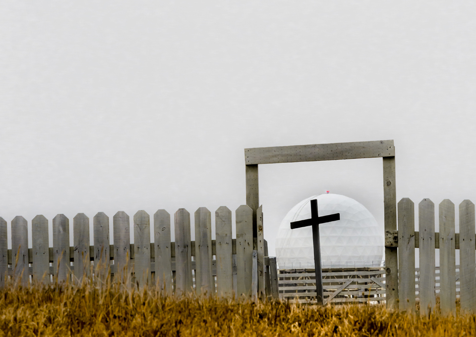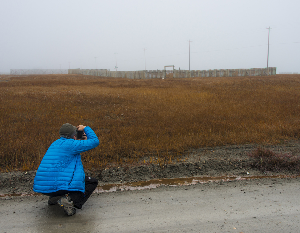 During the cold war, the U.S. maintained and listening and communications station on Barter island. As the fog started to lift we could see the huge radar dome in the distance thru the cemetery’s gateway.