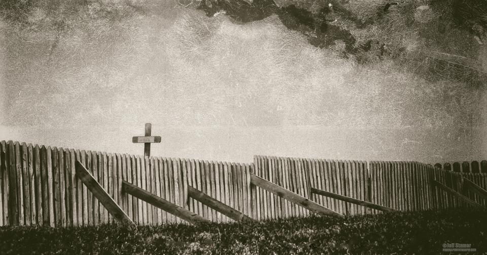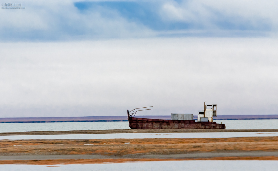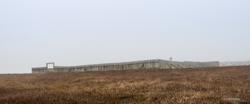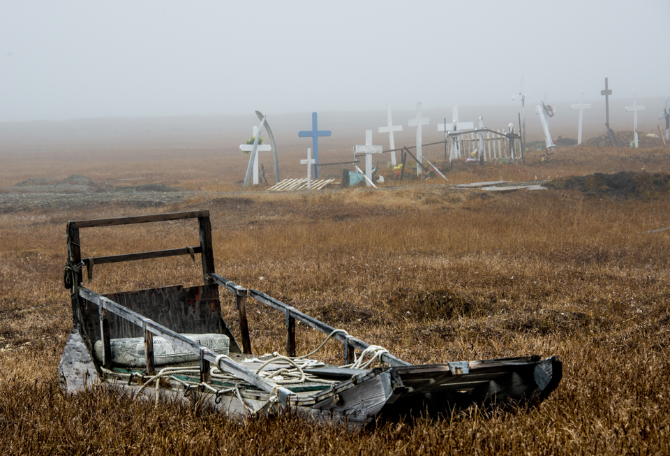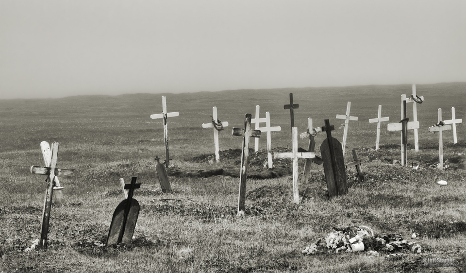 It sat in the middle of the tundra surrounded by a wood fence. Since we were guests in the village and wanted to be considerate to the feelings of the residents, Cesar and I stayed on the road and didn’t actually enter the cemetery. The solid overcast made the atmosphere somber and almost oppressive. But it sure fit the scene.