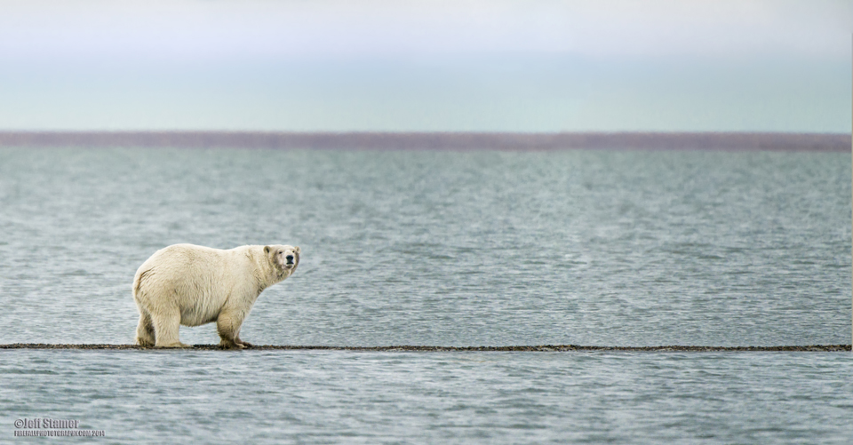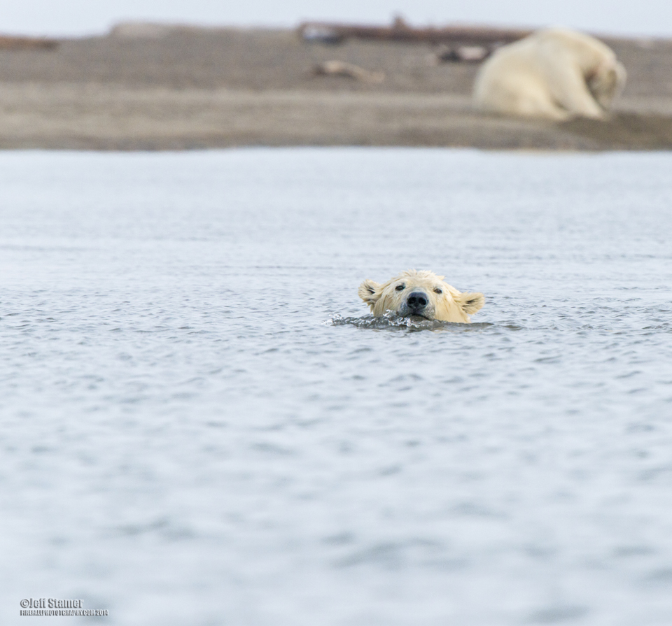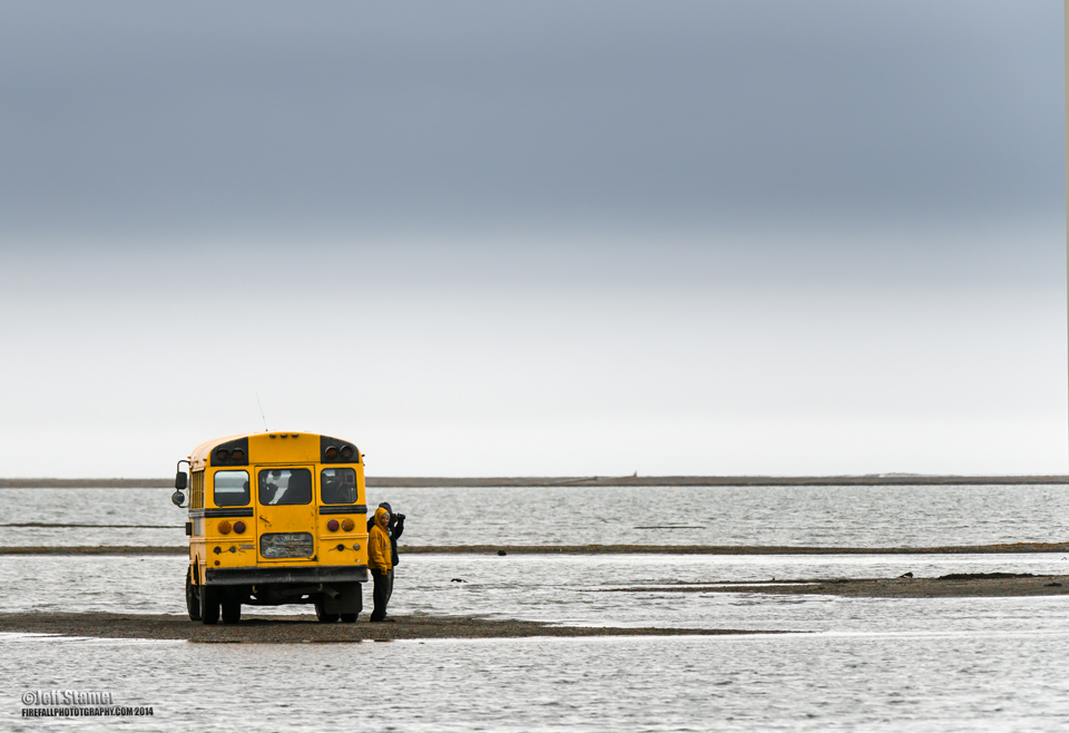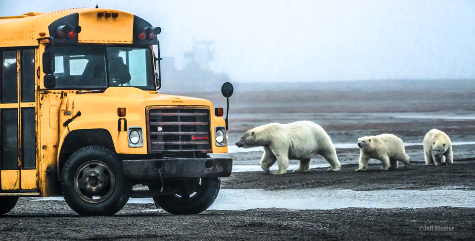 - The primary down-side of buses is that they can’t always get to where the bears are. The bears like to spend most of their day hanging out on a sliver of an island about a 1/4 mile or so from Barter island. There isn’t a bridge, so you have to wait for them to swim over to you. Fortunately, the bears do make the trip over nearly every day to feed at the boneyard (where the whales are butchered). However, this area can flood at high tide, so even if the bears are there, the buses can’t necessarily reach them.