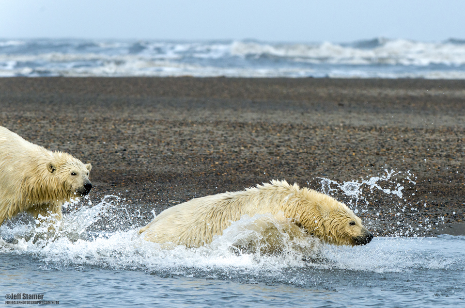 Although the sun wasn’t exactly shining, the cloud cover did thin out and we were finally able to get some good light. Better yet, the bears were very active …it was what military pilots call a ‘target-rich environment!” I took more photos during the next couple hours than I took on the rest of my entire 10 day tour. The most exciting 40 minutes of the trip unfolded when two cub siblings ran into the surf and had a rambunctious (but good-natured) battle: