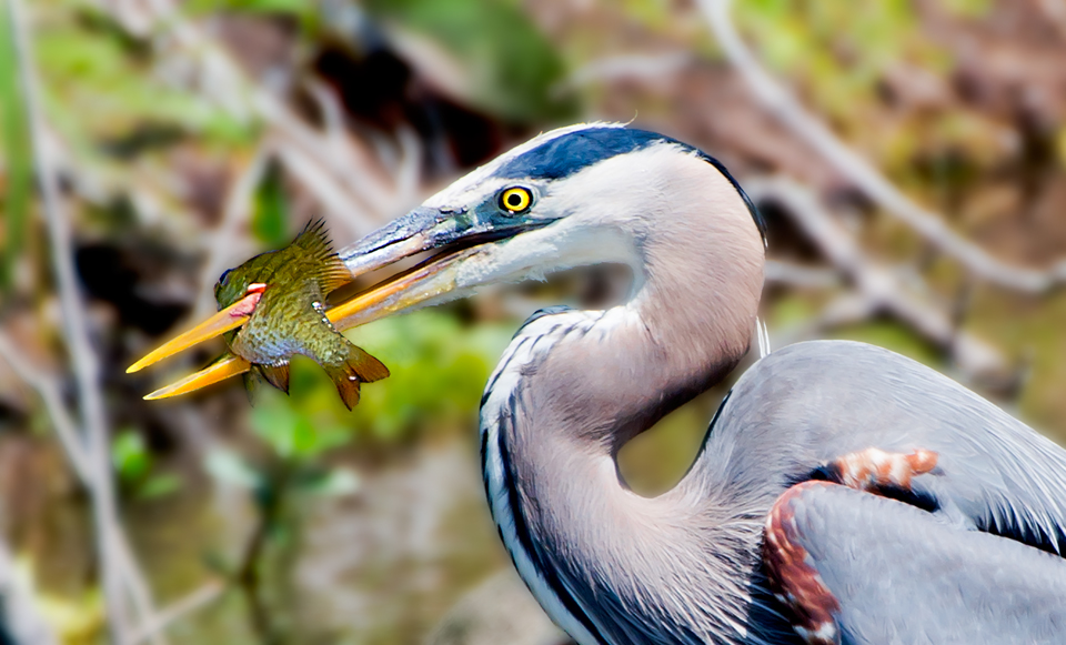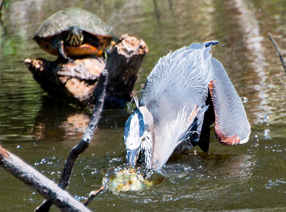 I kept my eye on the Heron while I filled my memory card with shots of the family…and then WHAM! The Heron jammed its bill into the water like a spear and skewered a small brim (we called them blue-gills up north).
