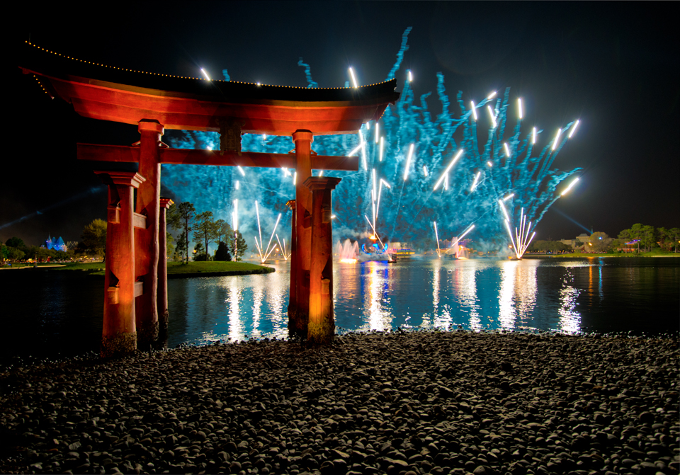 Taking a photo of a 100′ replica Eiffel Tower is just kinda embarrassing compared to the real McCoy. But, once you simply accept that it is all a man-made fantasy…and you shoot it with that mindset, then it can actually be fun! For example, here is a shot of the torii of Itsukaushima Shrine at the Japanese pavilion during the nightly fireworks show…no one could possibly mistake it for the real thing, but just the same, I like the image…how about you?