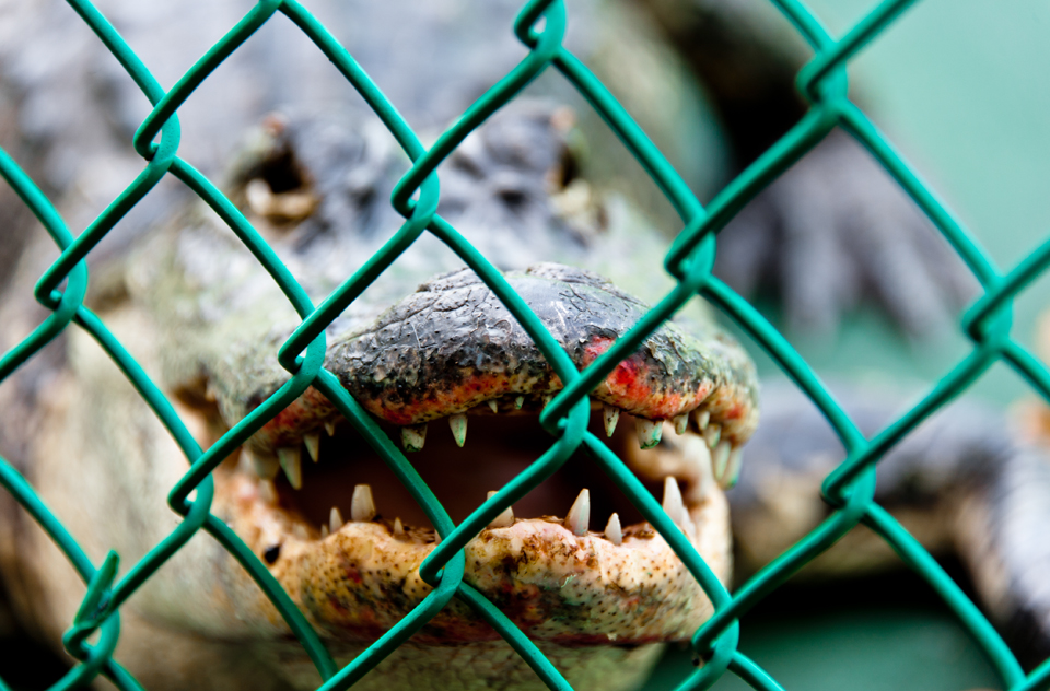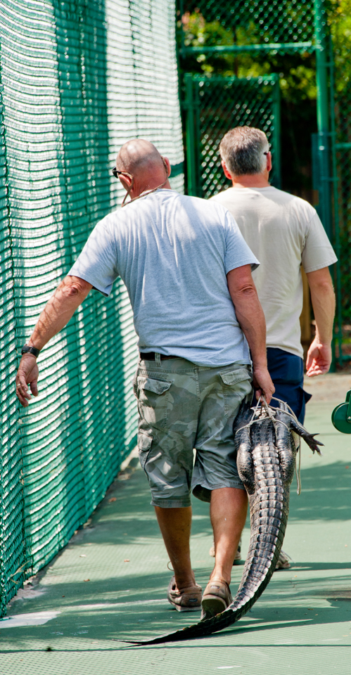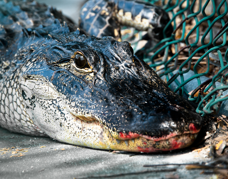 This gator had entered the caged court the night before thru a door that had been left open. The door shut automatically trapping it inside. Apparently it had been trying to get out for a while…it was exhausted and its snout was bloody from slamming against the cage.