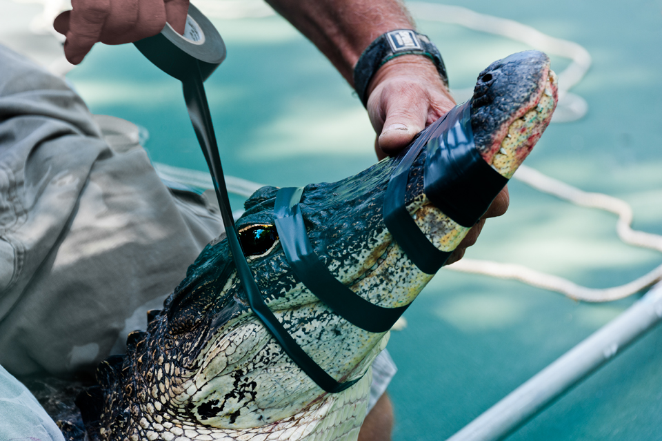 I’ll tell you, the trapper sure knew his business. In five minutes he had grabbed the gator, taped its mouth shut, trussed it up and carried it off the court.