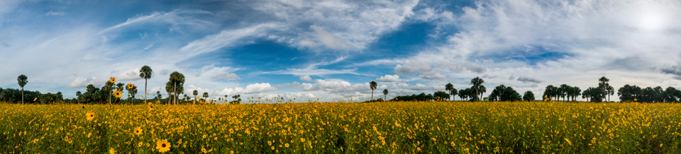 “Sunflower Island”  The oak and palm hammock in the background looks almost like an island floating in a sea of sunflowers in this six-frame panorama.