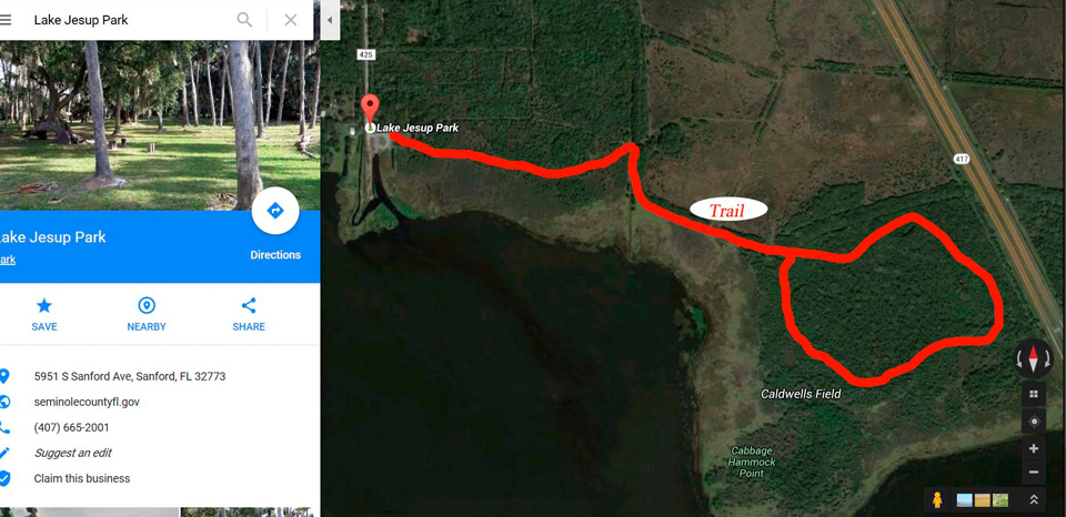 1. Caldwell Fields is very close to the Marl Bed Flats (basically just on the other side of the 417).  You can get there from a trailhead located in Lake Jesup Park (see map below).  This has the potential to be a wonderful spot since part of the trail is atop a berm…which provides expansive views thanks to the height.  Unfortunately, the trail to the berm is at a very low elevation and unless it has been a ‘dry’ year, it will likely be impassable.Lake Jesup Park Calwell's Field full res