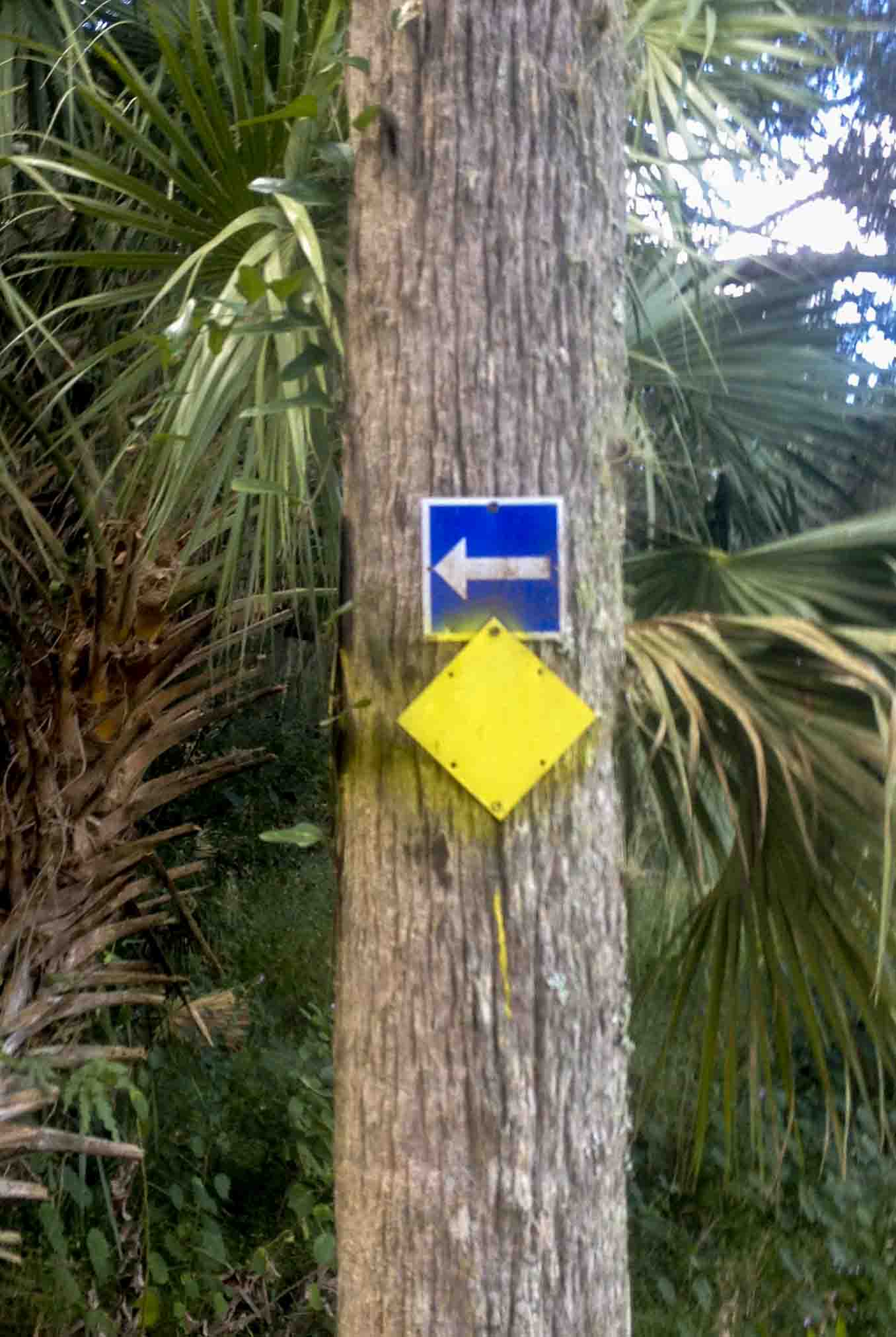 1. At the first split in the trail described above, take the trail to the right (it will be marked with yellow diamonds). Yellow Diamond This trail will take you through an oak hammock and will soon curve to the left (south).  Continue straight down on the trail (actually an old dirt road). As you reach the end of the tree canopy, you will notice that the trail/road is elevated and there is a narrow, nearly filled/overgrown canal to your right.