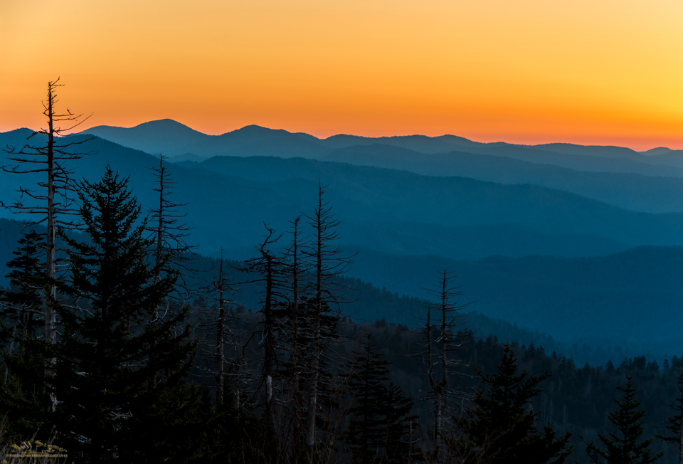 I hiked back to the Subaru and then joined the other photographers setting up for the sunrise on the edge of the parking lot. The lack of clouds eliminated any chance of a ‘National Geographic’ shot, but even an average dawn at Clingman’s is wonderful. There is nothing like the view of the dancing orange sky behind those blue mountain ridges receding off into infinity: