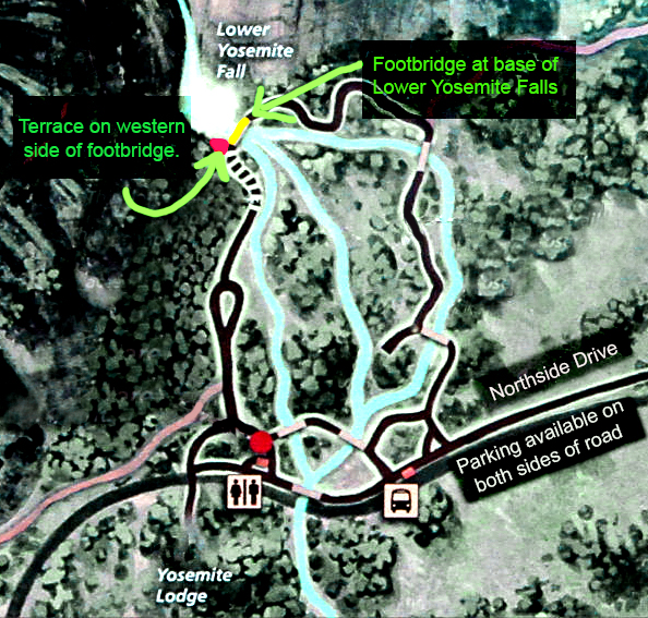 - Lower Yosemite Falls: The bridge and terrace at the base of the falls (see map below)