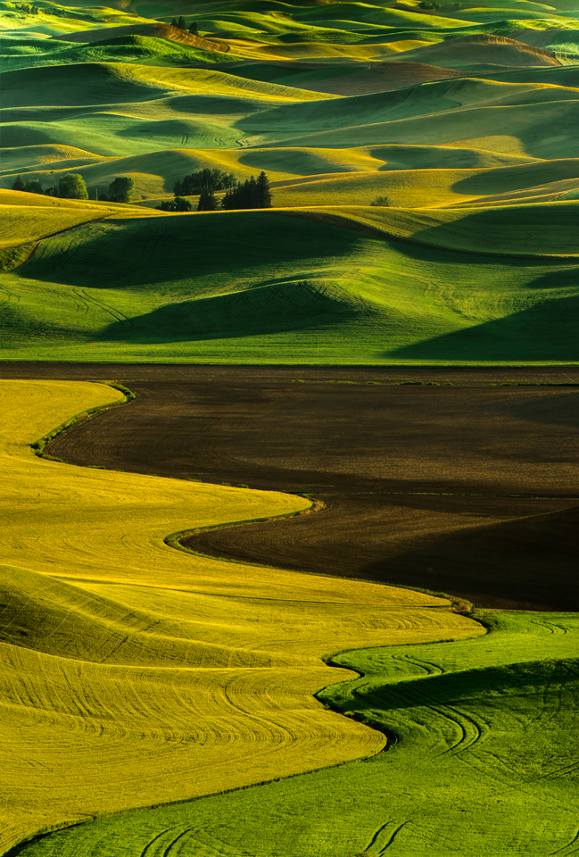 Dynamic Range: Full frame cameras, HDR, blending layers in Photoshop….many of us work hard to show the full dynamic range in our shots. Oddly enough, the Palouse is one of those venues where that might not be necessary..or even preferred. Those dark shadows contrasted by the brilliant crests of the hills seems to me to be a big part of the beauty of the Palouse. Do yourself a favor and try processing some shots where you can’t see every detail in the shadows…you might like the result.