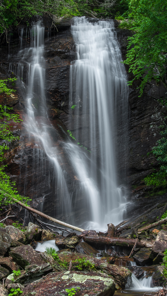After a leisurely hour drive from Toccoa, I passed the quaint (and tourist intensive) Alpine village of Helen and reached the Chattahoochee-Oconee National Forest. My goal was Anna Ruby Falls, which is actually two separate streams that fall over the same granite cliff, then merge before heading to the Chattahoochee River and finally concluding its journey 500 miles later in the Gulf of Mexico. It was a much shorter trip for me: I was setting up my tripod after a short (.8 mile) walk on the asphalt trail.