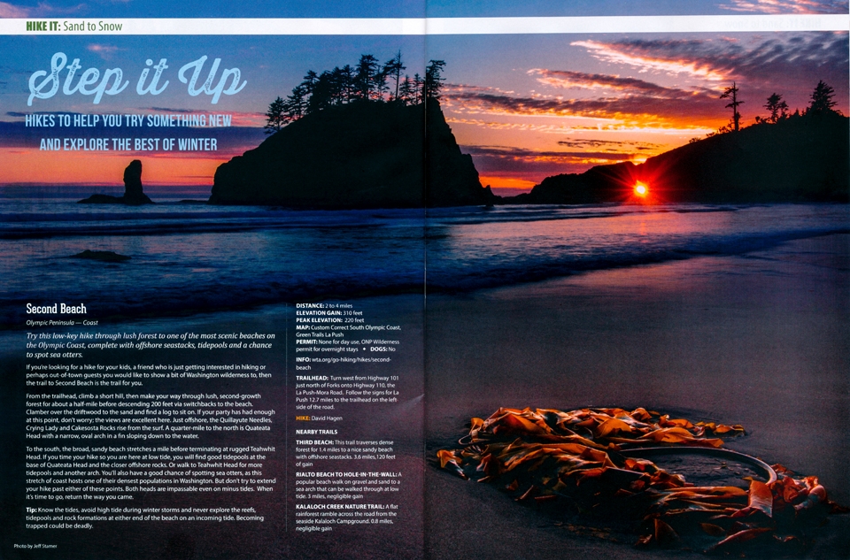 I was excited to hear that one of my photos was featured in this month’s edition of Washington Trails magazine. They had an article about Second Beach in Olympic National Park and they chose one of my images for a two page spread.