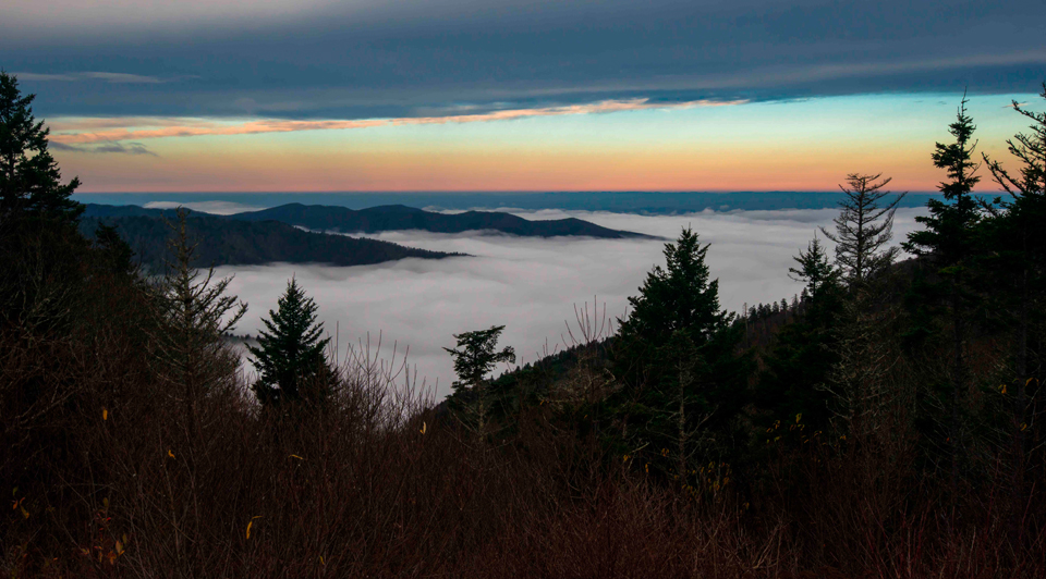 We drove up to Clingman’s Dome nearly every morning and evening hoping to capture one of those iconic Smokies, layered-mountain scenes…but it was not to be on this trip. My best effort was on the way back down the mountain when the clouds parted briefly and I swerved off onto an overlook to grab this shot.