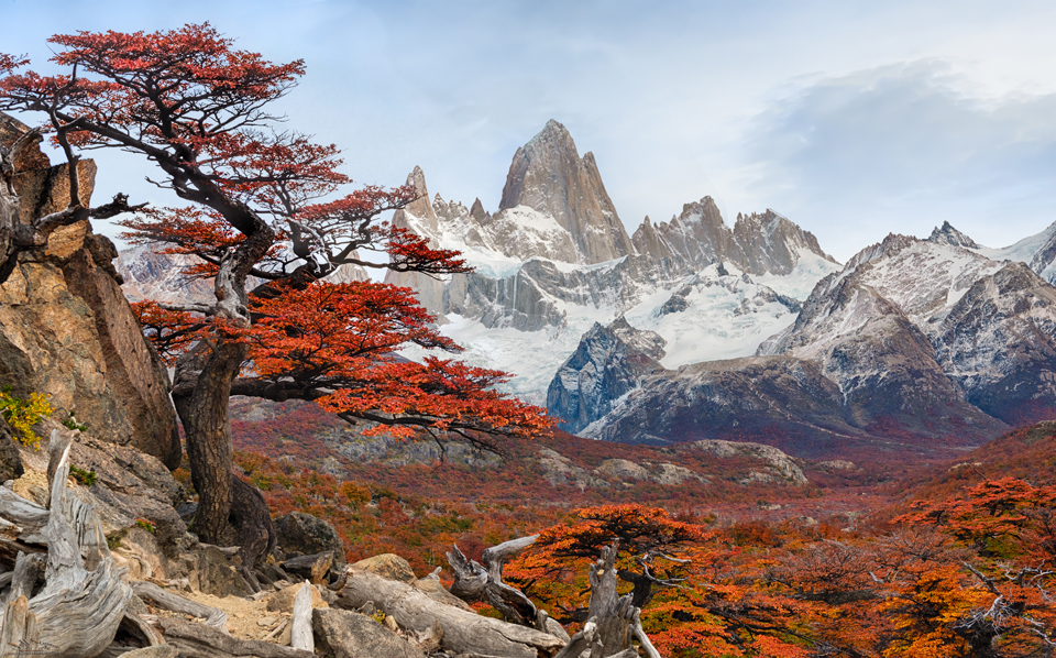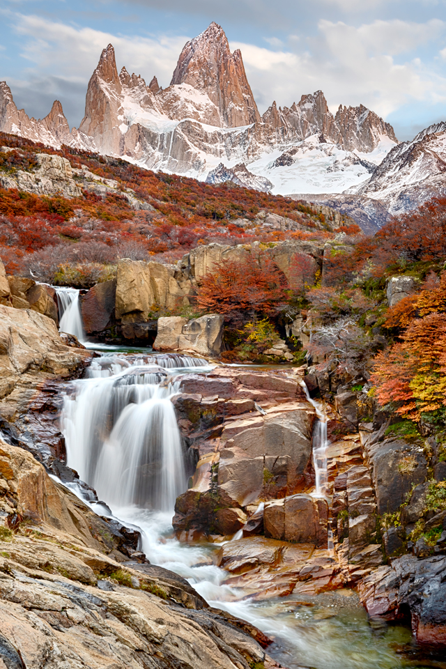 A print of this view of Mt. FitzRoy framed by an Antarctic Beech tree and a valley of crimson autumn leaves is hanging on the wall in my den. It wasn’t a planned shot, I just noticed the view when I glanced over my shoulder while hiking back from a sunrise shot. The sunrise photos were fine, but this spontaneous view captured the magnificence of Patagonia far better.
