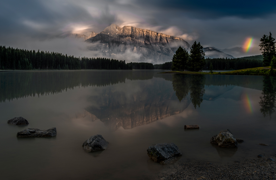 Now, there wasn’t much in the way of color, but hey, it wasn’t raining (for once) and we could actually see the mountain. So we set up our tripods and started to snap a few shots of Mt Rundle. And then, gradually, a bit of sunlight struggled thru the overcast skies and a small, partial rainbow shimmered to